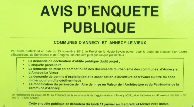 Après obtention d’un délai bien justifié pour exploiter les 1953 observations (dont 217 favorables), nos vaillants commissaires enquêteurs émettent, ce 2 mai 2016, un avis défavorable à la demande de Déclaration d’Utilité Publique concernant la construction d’un centre de congrès sur la presqu’île d’Albigny.